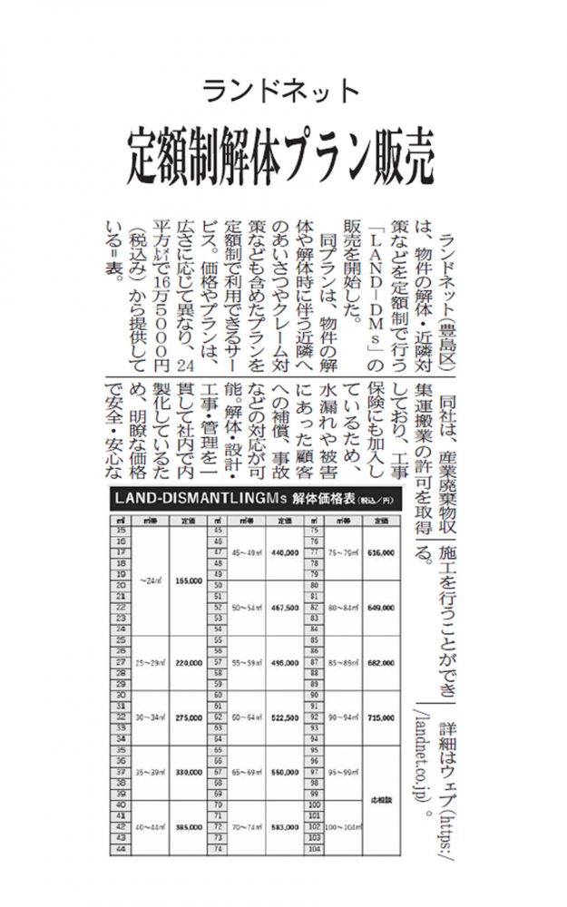 建通新聞に、当社の定額制解体プラン『LAND-DMs』について掲載されました。