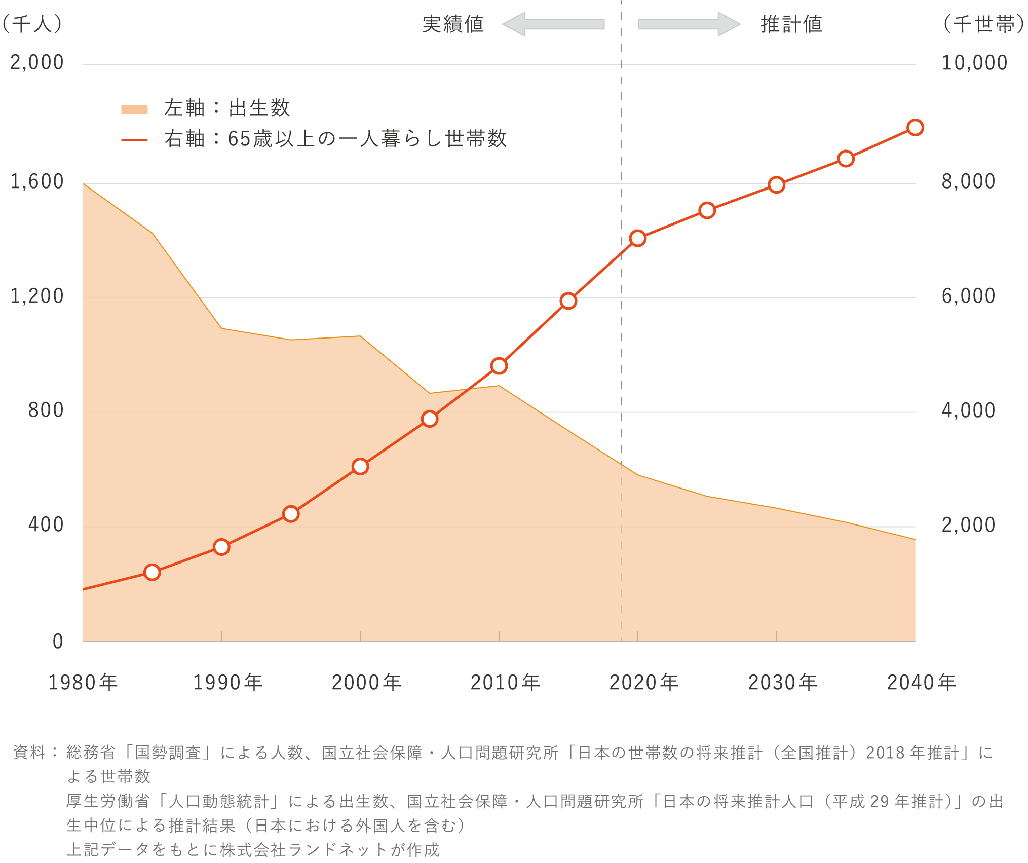「出生数」と「65歳以上の一人暮らし世帯数」の推移