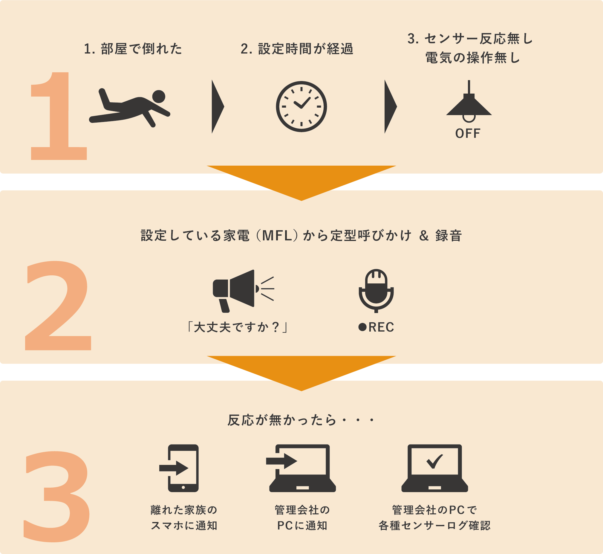 その後、入居者本人に向けて録音記録を添付した安否確認メールを送付します。メールの開封による安否確認ができない場合は、離れて暮らす家族やマンション管理会社等に第2、第3通報を行うことで、通報を受けた家族や管理会社スタッフに駆けつけなどの連携を促します。