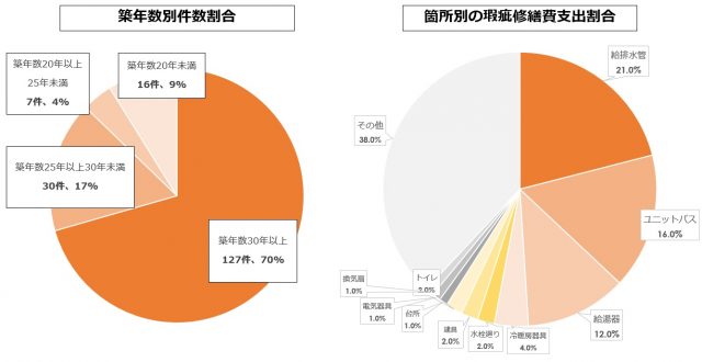 前期(2020年8月~2021年7月)から今期(2021年8月~2022年1月)までの累計保証件数は180件となり、「築年数別件数割合」では築30年以上が70%(127件)と一番多く、「箇所別の瑕疵修繕費支出割合」では給排水管が21%、ユニットバスが16%、給湯器が12%と続いております。