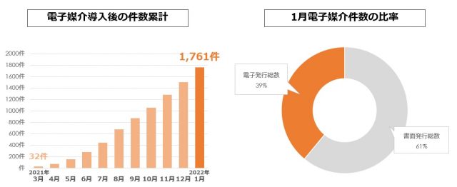 電子媒介契約を導入した2021年3月から現在まで(2022年1月31日時点)の「電子媒介契約数」の累計は1,761件となり、また1月の媒介件数比率は、「書面発行総数」が61%、「電子発行総数」が39%となっております。