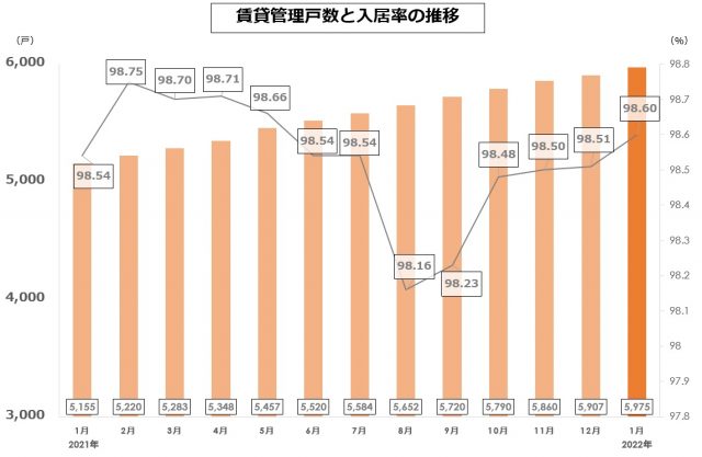 2022年1月末時点の「管理戸数」は5,975戸、「入居率」は98.60%となっております。