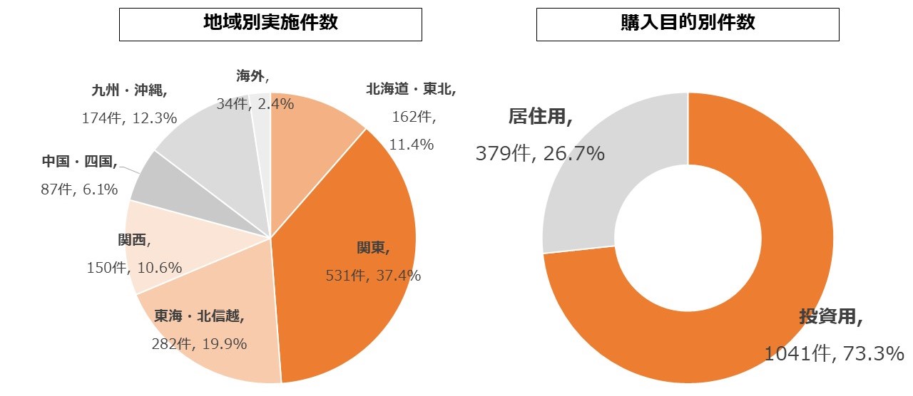 また投資用が73.3%(1,041件)、居住用が26.7%(379件)となり、エリア毎では、関東エリアが37.4%(531件)と1番多いものの、その他のエリア(北海道・東北、東海・北信越、関西、中国・四国、九州・沖縄)で合計60.3%(855件)と全国でIT重説を積極的に活用し、お客様の満足度向上に努めております。また、海外でもこれまでで34件実施しております。