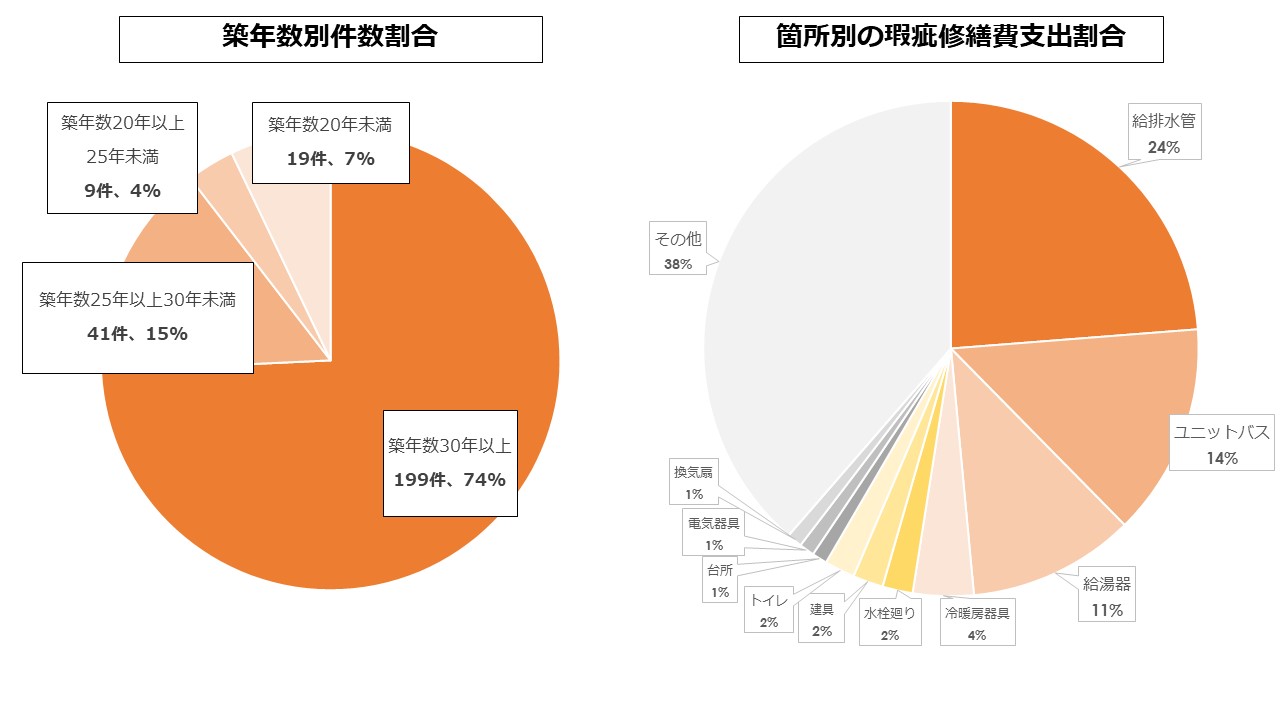2020年8月から2022年12月における累計保証件数は268件となり、「築年数別件数割合」では築30年以上が74%(199件)と一番多く、「箇所別の瑕疵修繕費支出割合」では給排水管が24%、ユニットバスが14%、給湯器が11%と続いております。