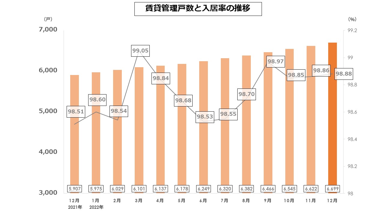 2022年12月末時点の「管理戸数」は6,699戸、「入居率」は98.88%となっております。