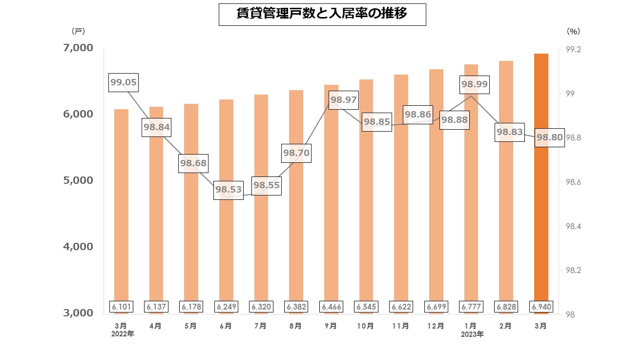 2023年3月末時点の「管理戸数」は6,940戸、「入居率」は98.80%となっております。