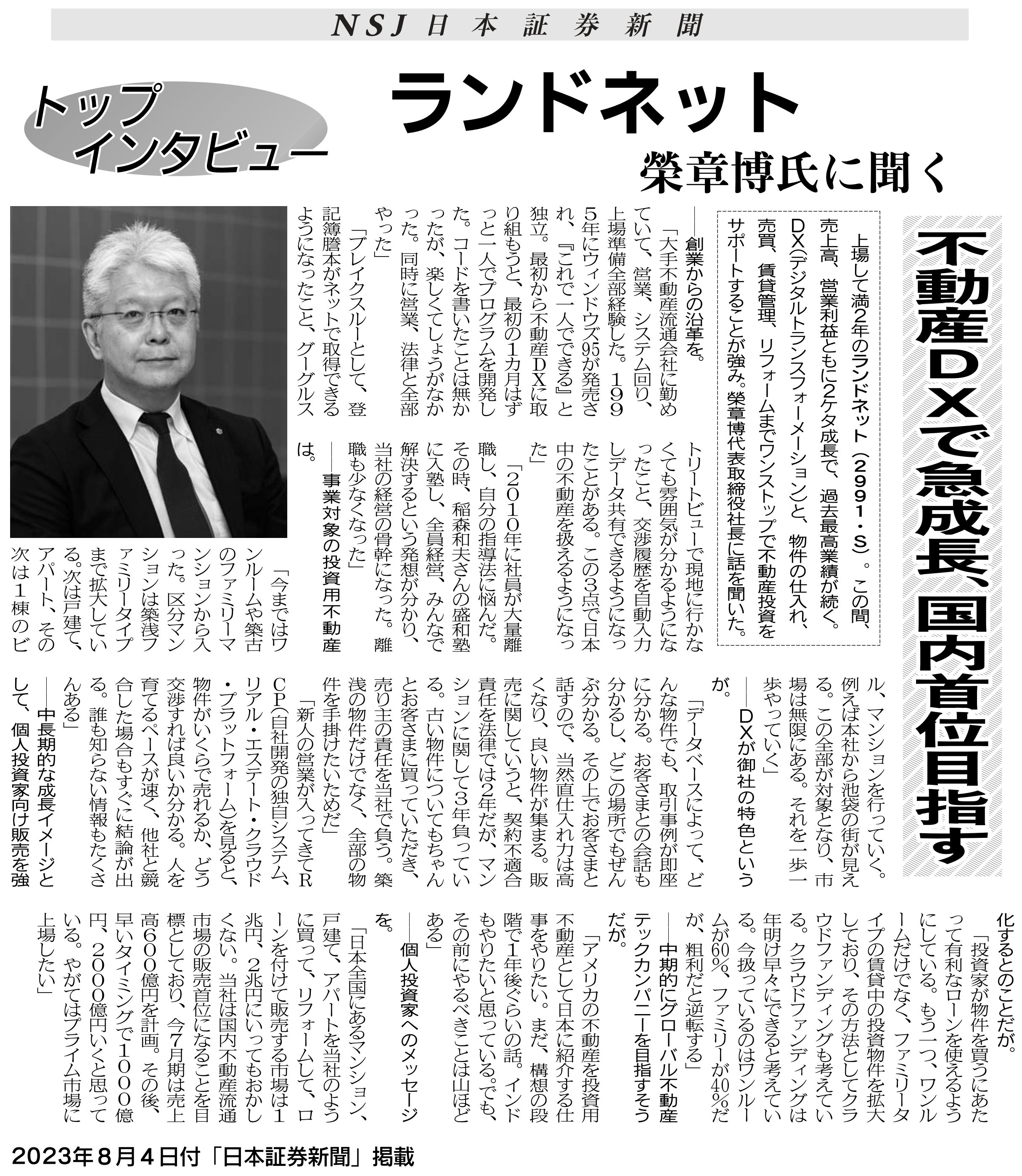 8⽉4⽇の⽇本証券新聞(株式会社⽇本證券新聞社発⾏)にて、当社代表・榮章博のインタビューが掲載されました。