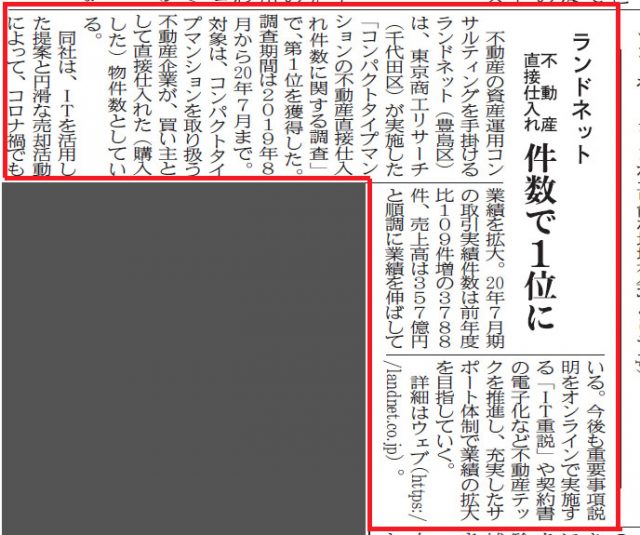 建通新聞に、東京商工リサーチが実施した「コンパクトタイプマンションの不動産直接仕入件数で当社がNo.1を獲得したことについて掲載頂きました。